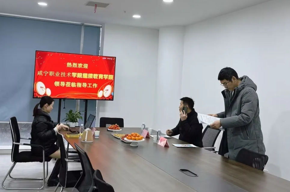 2024年1月18日下午,咸宁职业技术学院继续教育学院院长吴义三、继教院招生办主任周翔一行莅临我校实地考察、指导工作,武汉求学问校副校长周威等陪同考察。
